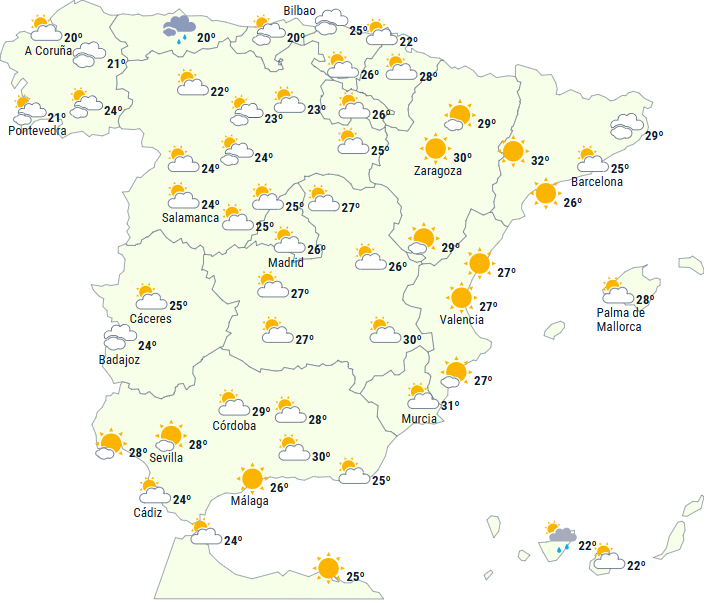 Dagstemperaturerne stiger let i centrum af halvøen og moderat i sydvest, uden væsentlige ændringer i øvrigt. Temperaturer på 34 til 36 grader forventes i lavlandsområder i Andalusien og på det nordøstlige af halvøen samt andre steder i sydøst og i indlandet på Mallorca.