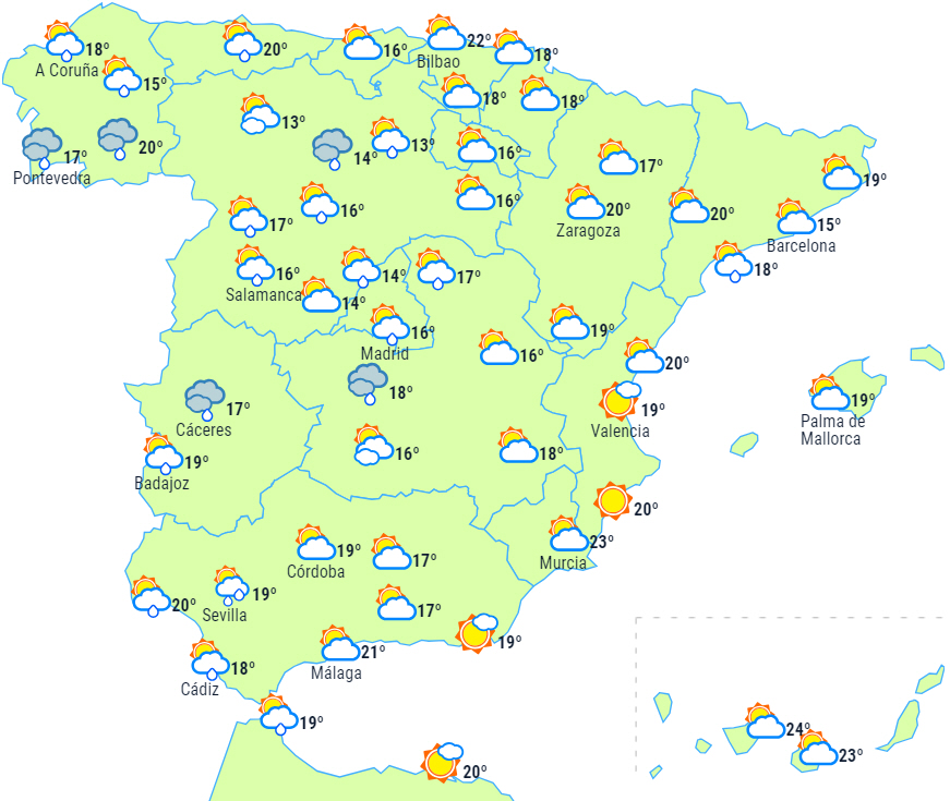 Alligevel forventes der perioder med mellem- og højtliggende skyer over den sydlige tredjedel af halvøen med mulighed for let regn til den sydlige halvdel af Andalusien.