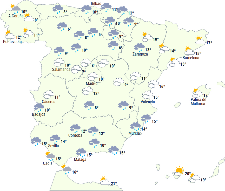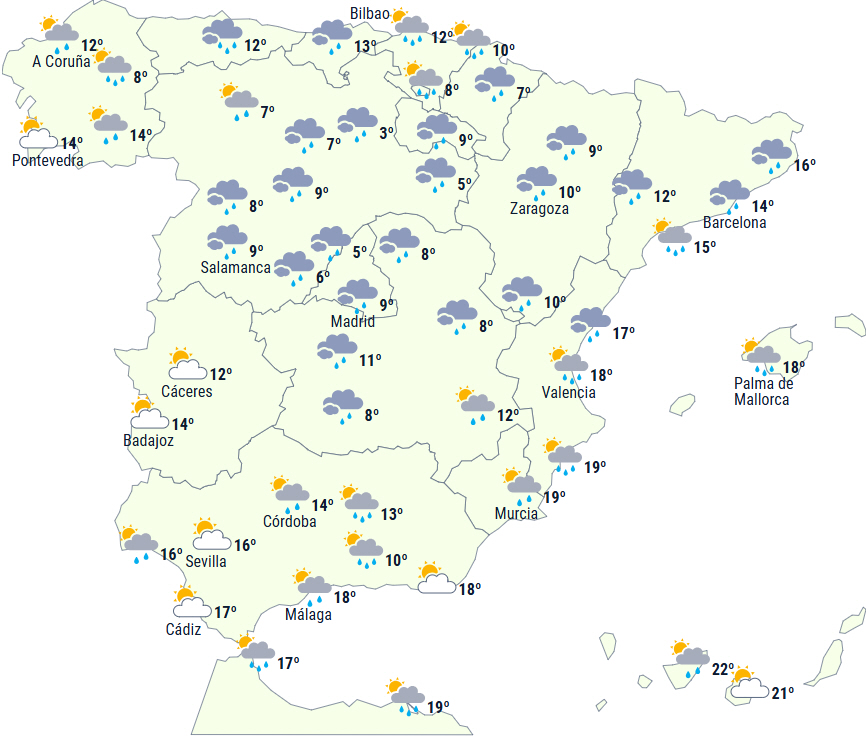 Nedbør kan blive vedvarende og/eller kraftig på den sydlige tredjedel af halvøen, hvor der kan registreres betydelige nedbørsmængder, og der er mulighed for lokalt kraftige byger på De Baleariske Øer om eftermiddagen.