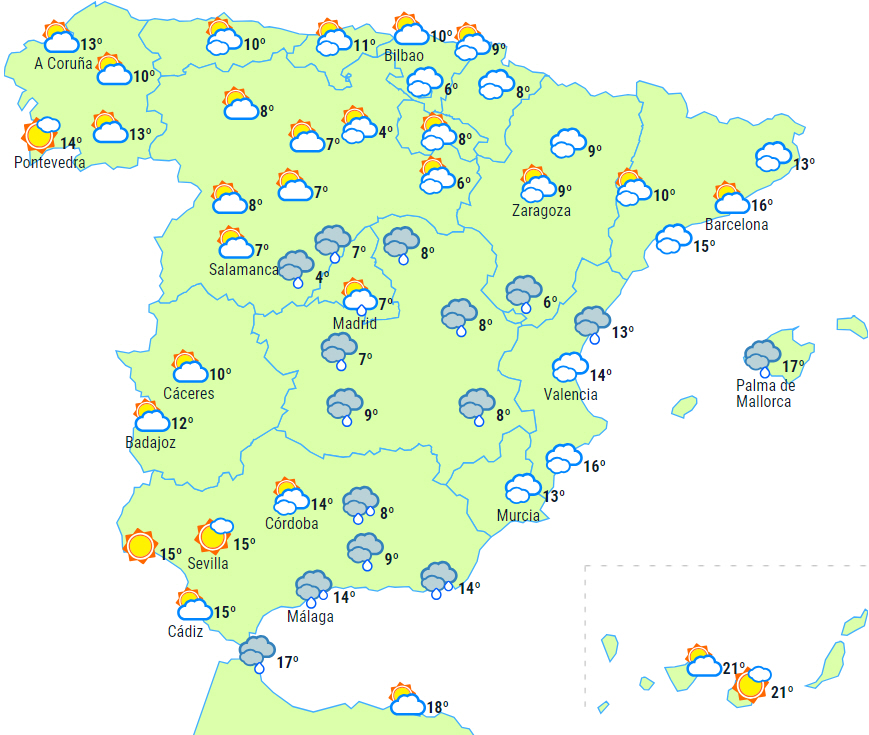 På halvøen og Balearerne forventes ustabilitet på grund af en DANA, der bevæger sig sydvestover. Nedbør forventes i det meste af landet, dog ser det ud til, at Atlanterhavsområderne i Galicien går fri sammen med lavtliggende områder i den nordlige del af højlandet og den øvre Ebro-dal. Lokalt kan nedbøren være tung og vedvarende og blive ledsaget af tordenvejr, i kyst- og præ-kystområder i Middelhavet og på Balearerne, men især altså i området mellem Ebro-dalen og Cabo de la Nao, kysterne i Málaga og Granada, de vestlige af Balearerne, hvor bygerne kan være meget tunge og endda voldsomme.