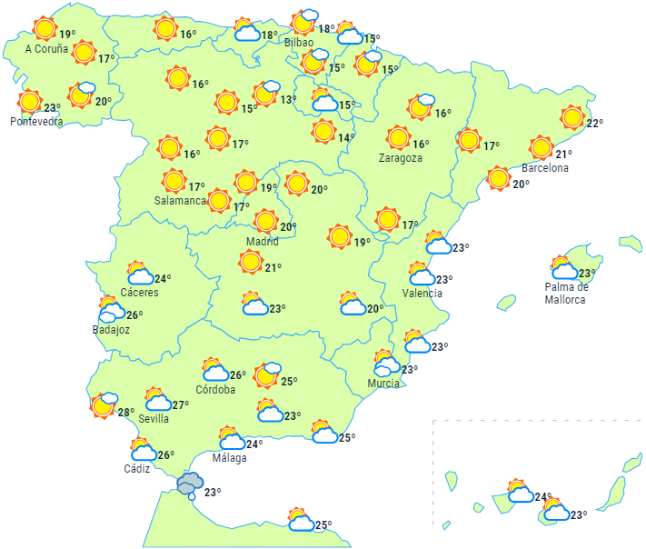Der forventes også skyet eller overskyet himmel med mulighed for spredte byger i det meste af Middelhavsområdet, der breder sig fra nord til syd, mere sandsynligt og kraftigt ved Barcelonas kyster, det nordlige Mallorca og sydøstlige af halvøen, uden at udelukke lokalt kraftige byger tidligt om morgenen på den sydøstlige kyst.
