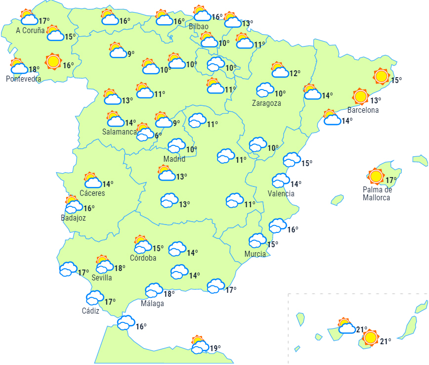 Temperaturerne vil stige lidt i det sydøstlige og nordøstlige Spanien og på De Baleariske Øer og vil falde i resten af landet. Nattemperaturerne vil stige i næsten hele landet. Svag nattefrost her og der i dele af det nordlige Spanien, mens det i bjergene i det centrale og nordlige Spanien vil være noget koldere.