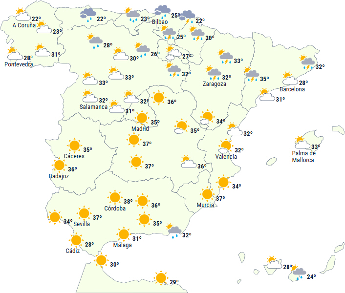 - Dagstemperaturer på over 36 grader i det centrale og sydlige af fastlandet og endda over 38 grader i nogle områder af Andalusien.