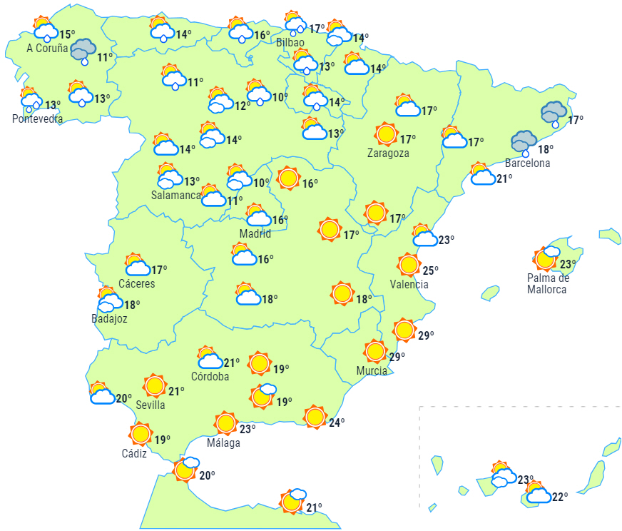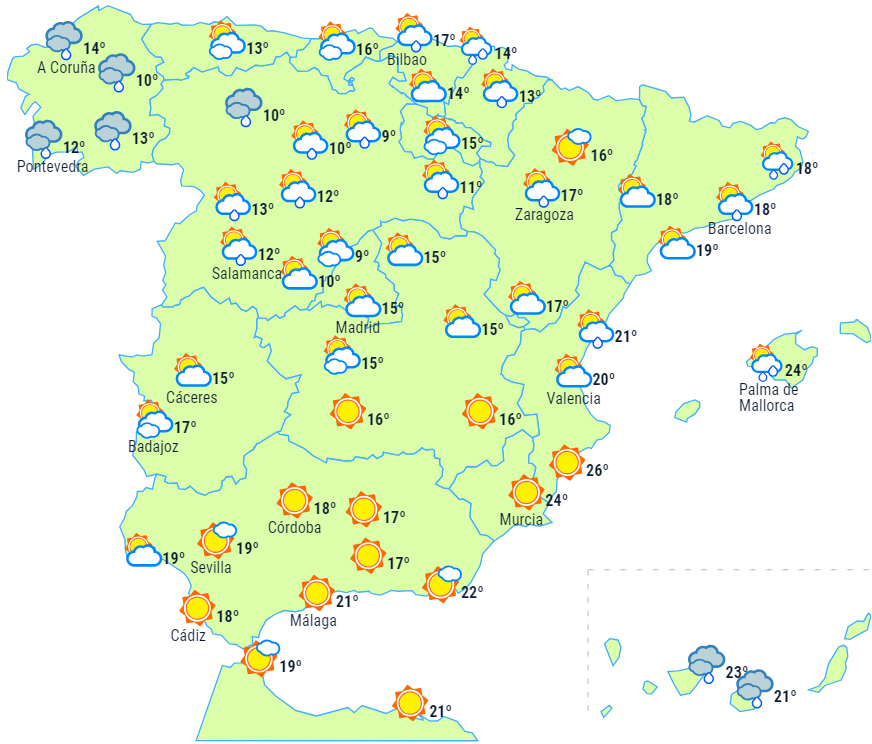 En front vil fortsætte med at bevæge sig over halvøen, og det påvirker den nordøstlige del med overskyet himmel og nedbør, lejlighedsvis ledsaget af tordenvejr, som kan blive kraftig eller vedvarende i Pyrenæerne og de omkringliggende områder. Det er heller ikke udelukket i de tidlige timer i La Rioja og Navarra, men det vil have en tendens til at aftage fra vest til øst.