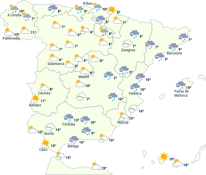 På Middelhavssiden, De Baleariske Øer og omkring Alboránhavet og Gibraltarstrædet kan nedbøren derimod være lokalt kraftig og/eller vedvarende og ledsages af tordenvejr med hagl. Samtidig vil en fugtig vind fra nord i Cantabrien give vedvarende, svag nedbør, men lejlighedsvis moderat langs kysten.