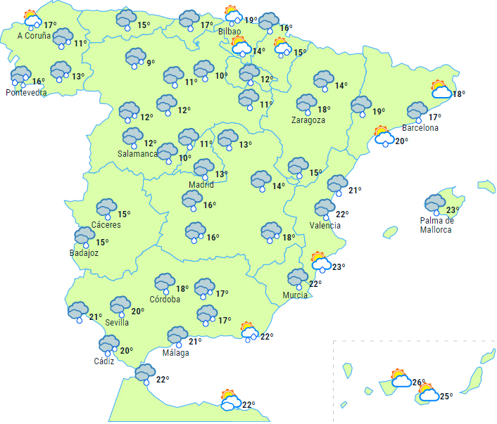 På Balearerne overskyet himmel med byger og tordenvejr. På halvøen vil en front, der bevæger sig fra vest til øst, give overskyet vejr og nedbør i nordvest. Nedbøren kan brede sig, om end i svagere og mere spredt form, til den nordlige højslette, den vestlige del af den sydlige højslette og de centrale bjerge, den øvre Ebro-dal, den nordlige del af de iberiske bjerge samt den vestlige del af Pyrenæerne.