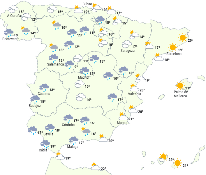 Ligeledes forudses lejlighedsvise tordenbyger i de vestlige og nordøstlige egne af halvøen, og nedbøren kan være kraftig i det vestlige Andalusien og i den nordøstlige del.