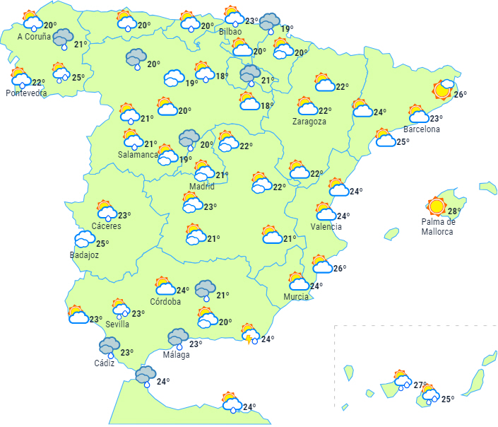 Sandsynlighed for regn i de sydøstlige bjerge og mulighed for kraftig regn i området ved Gibraltarstrædet, hvor det kan blive ledsaget af tordenvejr om eftermiddagen. Svagere og mere spredt nedbør kan forekomme i det indre af den nordvestlige halvdel, resten af Andalusien og på De Kanariske Øer, men der ventes dog mest regn i de vestlige Pre-Pyrenæer, de centrale bjerge, Andalusien og de bjergrige øer.
