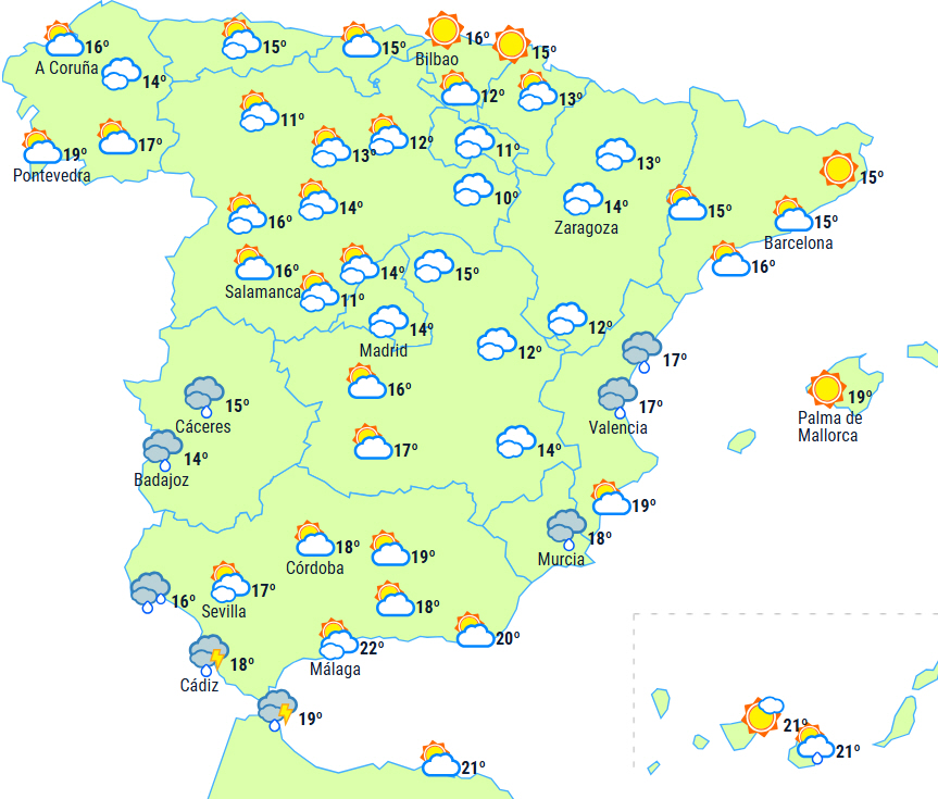 Der forventes til gengæld flere byger i det vestlige af de centrale bjerge, Extremadura og det vestlige Andalusien, endda lokalt kraftige eller vedvarende og ledsaget af tordenvejr i Huelva.