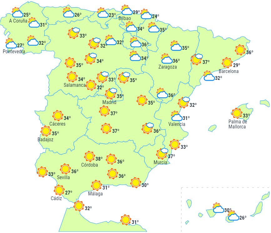 Varsler om meget høje temperaturer i dele af De Baleariske Øer, Andalusien og i det centrale og nordøstlige Spanien.