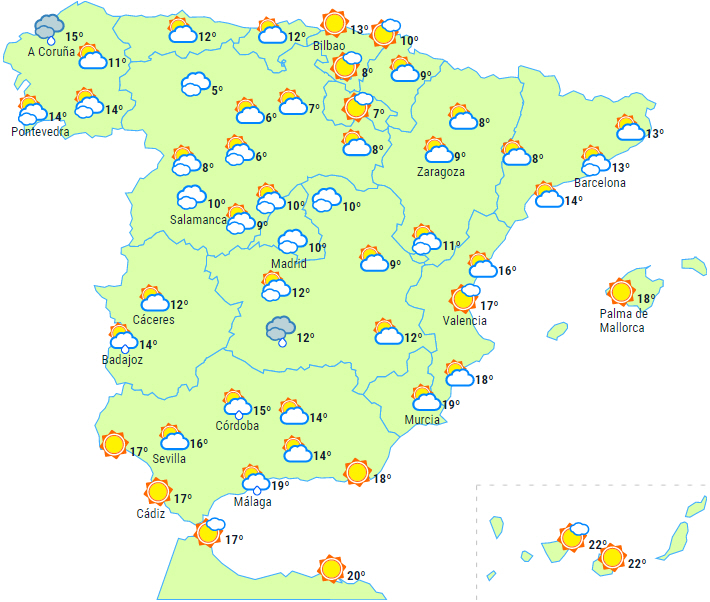 Skyet eller overskyet over det meste af halvøen med nedbør i nordvest, Pyrenæerne, det nordøstlige Catalonien og den sydvestlige del af halvøen, hvor nedbøren lejlighedsvis bliver ledsaget af tordenvejr. Vi kan heller ikke udelukke lokale og lejlighedsvise byger på resten af halvøen, undtagen i resten af Levante-området, hvor det forventes at holde tørt.