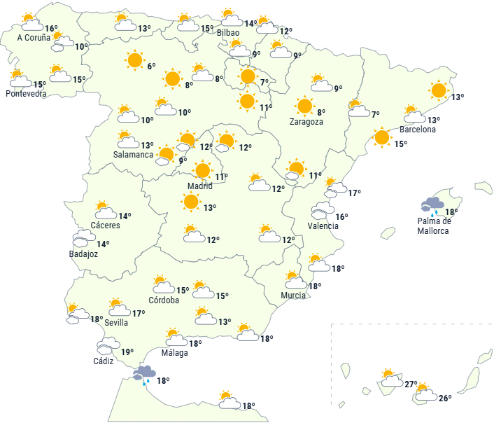 Der forventes også lavthængende morgenskyer over de indre områder af den nordlige halvdel med morgentåge, som kan være tykkere i den nordøstlige del af Galicien, den øvre del af Ebro-dalen, den nordlige højslette og de nordøstlige dale.