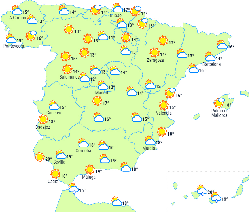 Overvejende letskyet eller klart vejr til halvøen og Balearerne, dog med enkelte mellem- og højtliggende skyer, som er mere udbredt over Balearerne og halvøens Middelhavsområder.
