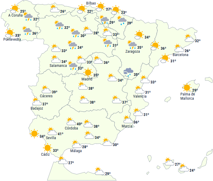 Temperaturerne overstiger 34 til 36 grader på størstedelen af den sydlige halvdel af fastlandet, dele af det nordlige højland, nordøstlige dale og lokalt i nordvest. Det er sandsynligt, at vi overstiger 38 til 40 grader på den sydlige del af Den Iberiske Halvøs atlantiske side.