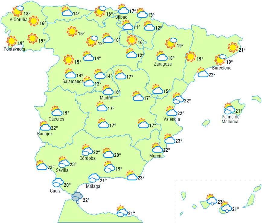 Skyet i den østlige ende af nordvestkysten, det nordlige Navarra og Pyrenæerne, og det kan give regn og byger. På resten af den nordlige del af halvøen, den østlige halvdel af den nordlige højslette og området omkring de centrale og iberiske bjerge mulighed for let regn og tendens til letskyet i løbet af dagen.
