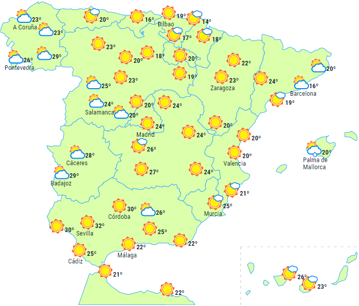 Dagstemperaturerne stiger i det vestlige Galicien og i Pyrenæerne og falder på den catalanske kyst og i Ceuta. Temperaturerne vil fortsat overstige 30 grader i det vestlige Andalusien.