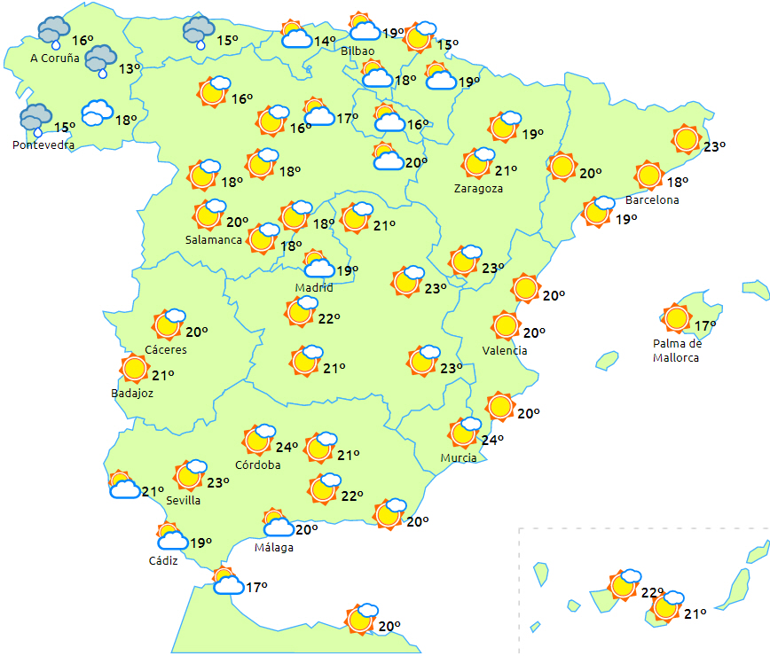 Det meste af Den Iberiske Halvø og Balearerne vil få vindstille, tørt og solrigt vejr. I nord forventes der dog i første omgang overskyet himmel med spredt regn i Galicien, den østlige del af nordvestkysten og de vestlige Pyrenæer, men efterhånden tendens til at klare op.
