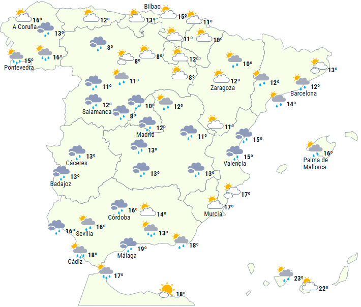 Nedbør kan også nå andre steder af halvøen og De Baleariske Øer, men det skulle holde tørt i det nordøstlige hjørne og ved Cantabrien.