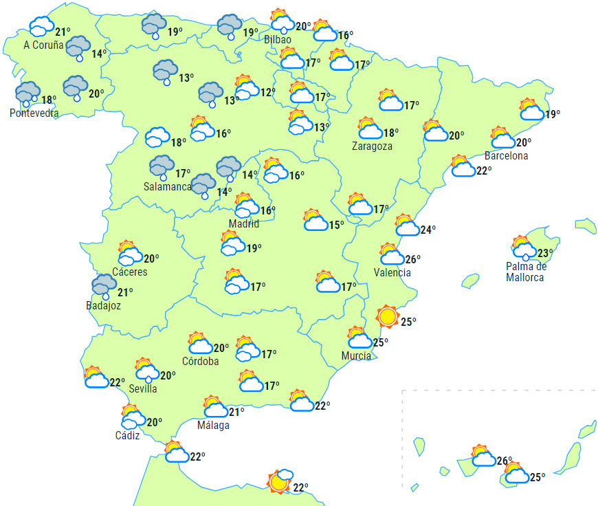 Det ustabile vejr forventes at fortsætte på halvøen og De Baleariske Øer med praktisk talt nedbør overalt - lejlighedsvis med tordenvejr.