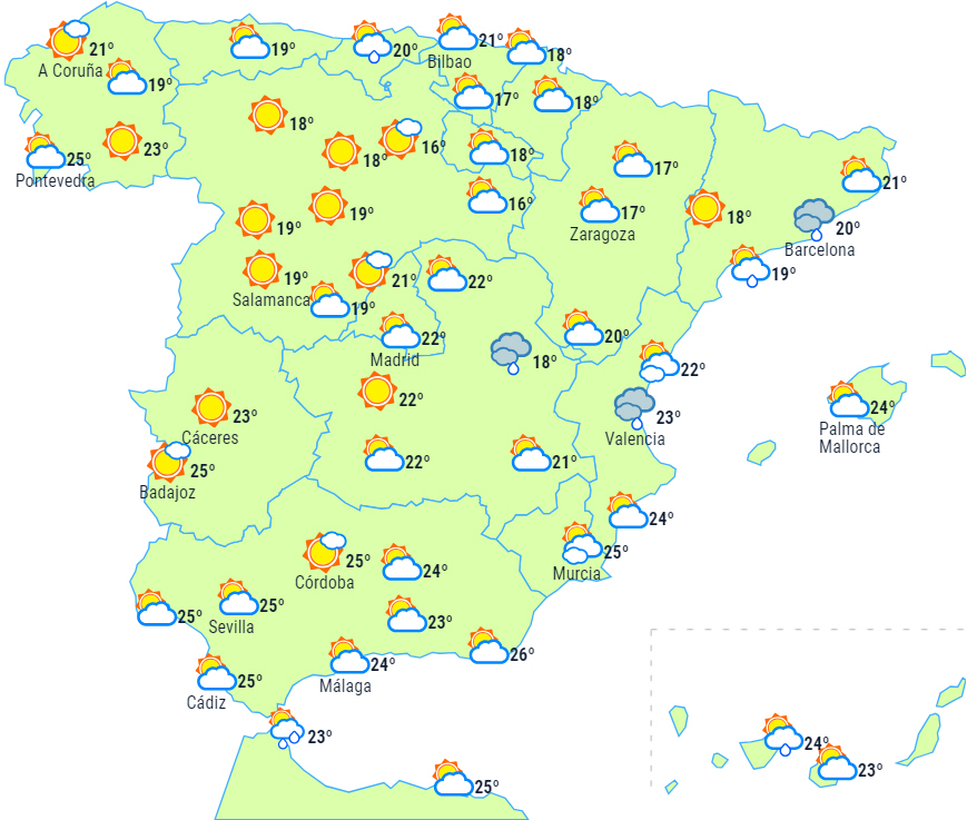 Stabiliteten forventes at fortsætte på det meste af halvøen og Balearerne med overvejende letskyet himmel. Imidlertid vil et lavtryk sandsynligvis nærme sig det østlige Middelhavsområde og give tiltagende skydække fra nordøst mod sydvest med mulighed for spredte byger og noget tordenvejr, der generelt er i den svage skala, dog mere intens nedbør i de østlige indre dele af Catalonien, Valencia og de sydøstlige bjergkæder.