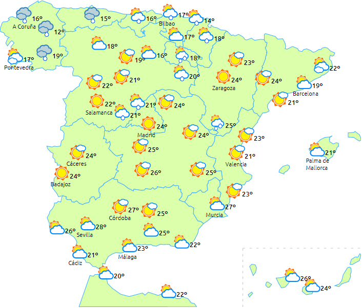 Dagstemperaturerne vil falde i det meste af landet, mens vi fortsat ligger over normalen på De Kanariske Øer, hvor man nogle steder kan komme over 30 grader. Nattetemperaturerne vil falde på den nordvestlige del af halvøen med frost i Pyrenæerne og i de nordvestlige bjerge.