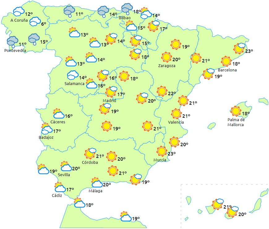 Tørt og solrigt vejr på halvøen og Balearerne. En Atlanterhavsfront vil dog medføre en gradvist øget skydække over den nordvestlige tredjedel med lette nedbørsmængder, der starter i Galicien og breder sig til omkringliggende områder, den øvre Ebro-dal, dele af De Iberiske Randbjerge og Pyrenæerne.