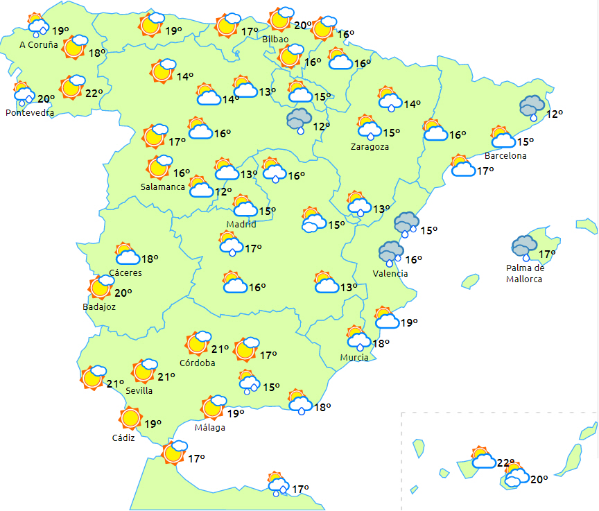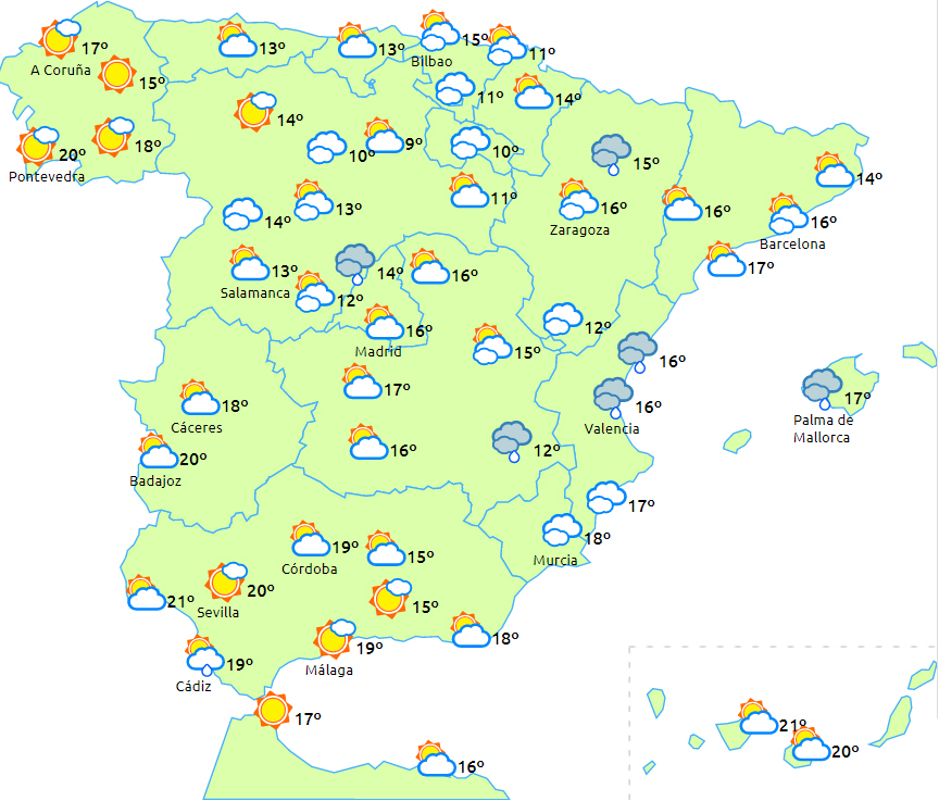 Dagstemperaturerne stiger på De Kanariske Øer og på halvøen, mens de dog kan falde en smule i den nordlige del af Middelhavsområdet og på den helt sydvestlige del af halvøen. Nattemperaturerne vil generelt falde, og der ventes let frost i Pyrenæerne og De Cantabriske Bjerge.