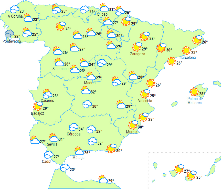 Dagstemperaturerne stiger på det meste af halvøen, Melilla og de centrale dele af De Kanariske Øer, mens der kun sker små ændringer på Balearerne. Nattemperaturerne vil kun ændre sig lidt, bortset fra en stigning i de centrale dele af De Kanariske Øer.