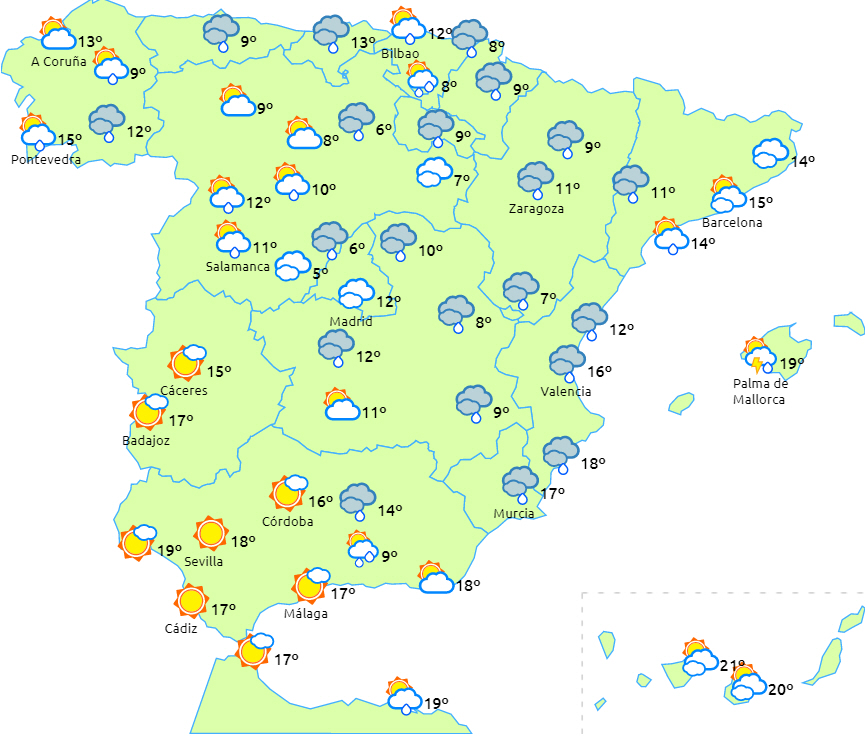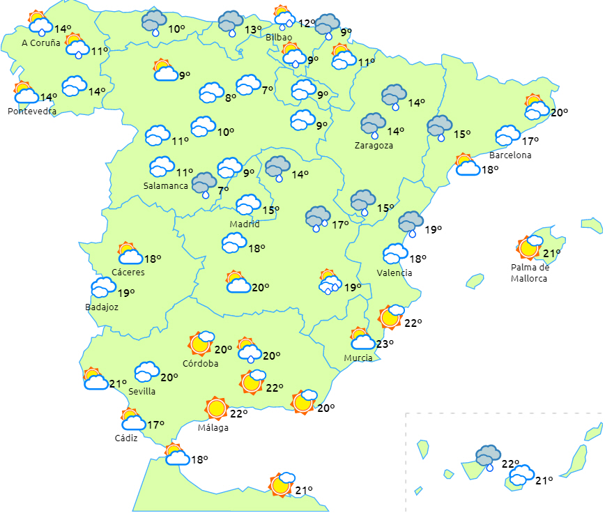 Der er udsigt til overskyet vejr og udbredt nedbør på halvøen undtagen i den sydlige del. Nedbøren breder sig mod syd og øst med kraftigere regn ved nordvestkysten og i Pyrenæerne - lokalt kraftig eller vedvarende i de centraløstlige områder. Nedbøren bliver ledsaget af tordenvejr i store dele af indlandet og i de østlige kystområder.