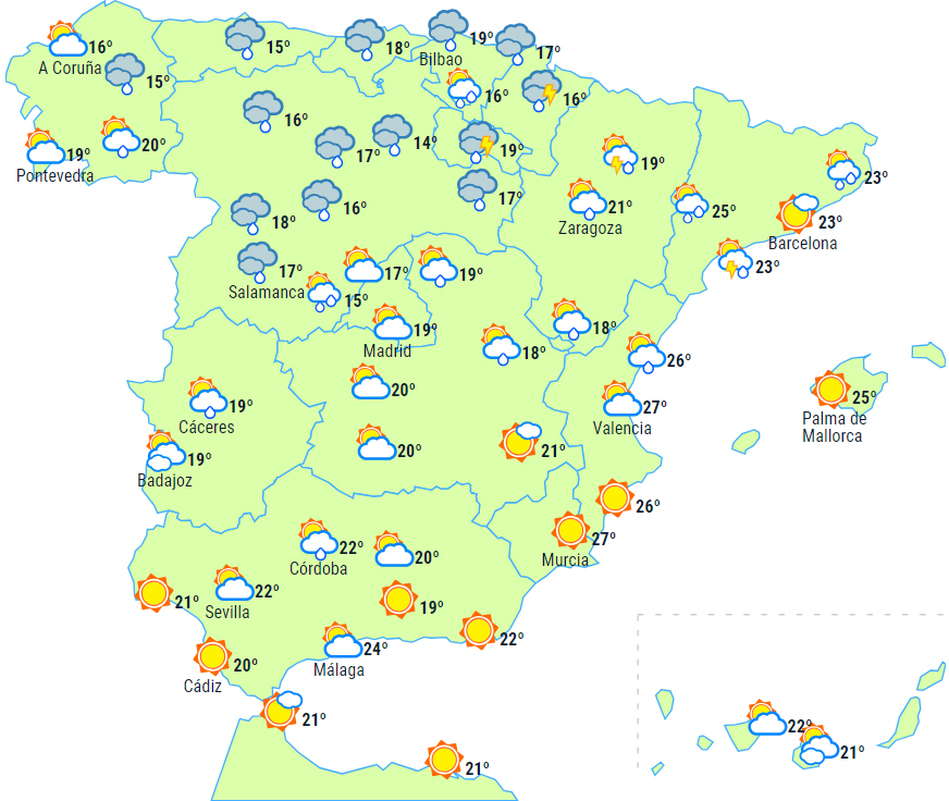 Lejlighedsvis nedbør ledsaget af tordenvejr forventes fra de tidlige timer i det cantabriske område og det nordlige Galicien, lokalt kraftig nedbør i kystområderne i Asturien og Lugo, som vil brede sig til resten af den vestlige halvdel af halvøen om eftermiddagen såvel som til den øvre Ebro-dal, de iberiske og cantabriske bjerge, Pyrenæerne og de omkringliggende områder.