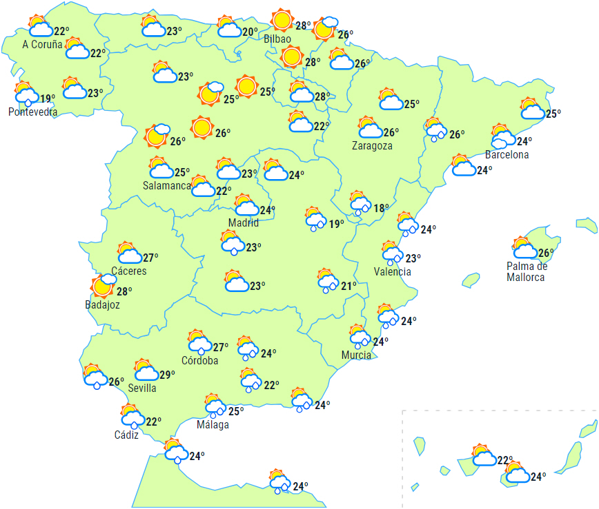 Letskyet på resten af halvøen med tiltagende skydække, som kan smide nogle svage byger af sig over det vestlige Cantabrien, De Iberiske Randbjerge, nordsiden af Pyrenæerne og de catalanske kyster.