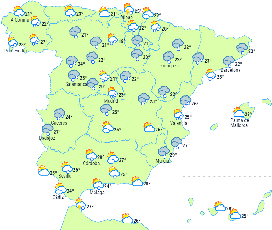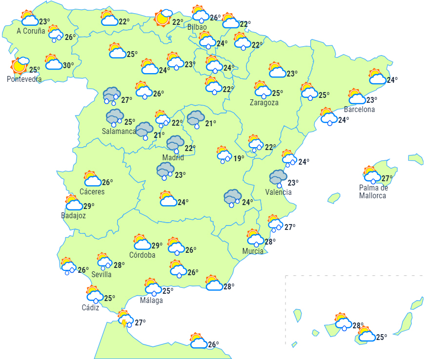 Tendensen til ustabilitet forventes at fortsætte på halvøen med gråvejr og byger ledsaget af tordenvejr. Nedbøren vil fra de tidlige morgentimer påvirke centrum og centrum-øst og strække sig mod sydvest, Melilla og det sydlige af det nordlige højland, men det kan også påvirke den nordøstlige del af halvøen.