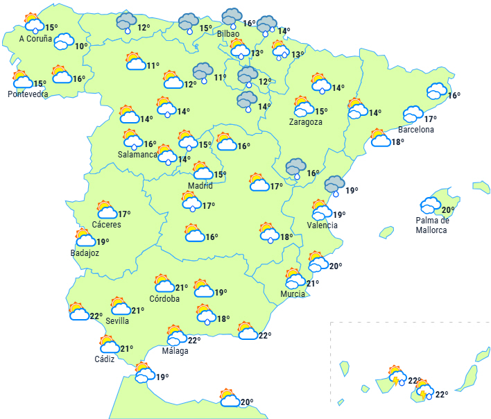 Der forventes ustabilt vejr på halvøen og Balearerne med passage af en front, der giver skyer og nedbør, når den bevæger sig fra vest til øst og påvirker det meste af den nordlige halvdel af halvøen.