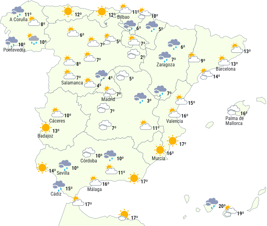 I takt med frontens passage ventes der udbredt svag til moderat nedbør. Ankomsten af en ny front i løbet af eftermiddagen vil medføre, at nedbøren vil være vedvarende på den vestlige del af halvøen og hovedsageligt på kysterne i vest og nordvest for Galicien, hvor den lokalt kan være kraftig og blive ledsaget af lejlighedsvis torden.