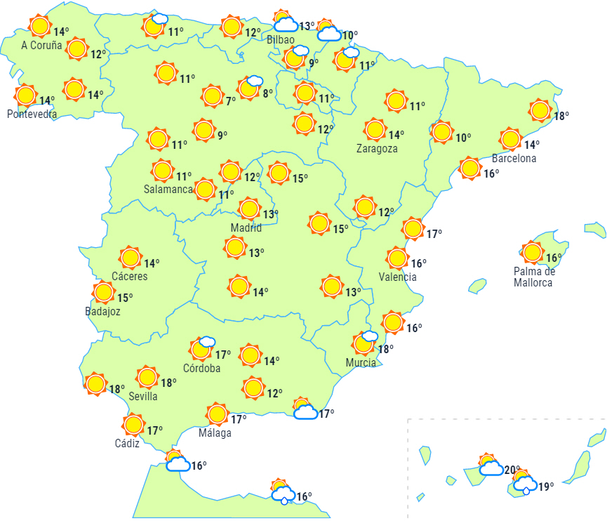 Stabilt vejr med letskyet eller klart vejr til det meste af landet. I begyndelsen af dagen forventes der dog overskyet eller delvist overskyet himmel over det nordlige Galicien, Cantabrien, den øvre Ebro-dal og den nordlige højslette. Det kan også komme lette og spredte byger på den cantabriske kyst, mens det i den anden halvdel af dagen bliver letskyet eller klart.