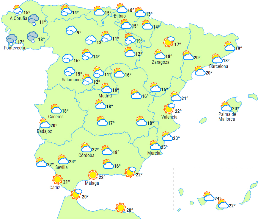 Skyet i perioder i nord, og overvejende skyet himmel tidligt om morgenen og delvis skyet himmel i de centrale timer med mulighed for lette og lejlighedsvise byger i løbet af dagens første halvdel. Andre steder letskyet eller klart. Temperaturer med små ændringer på 18 til 22 grader.
