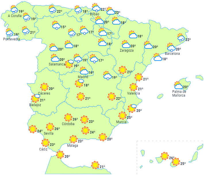 På den nordlige del af halvøen og Balearerne forventes større ustabilitet, mens der på resten af halvøen vil være nogenlunde klar himmel. Efterhånden flere skyer fra nordvest til sydøst på den nordlige halvdel af halvøen og De Baleariske Øer med nedbør i det cantabriske område, den øvre Ebro-dal, den nordlige del af halvøen og Pyrenæerne. Spredte byger er ikke udelukket i andre dele af Galicien, den østlige del af de centrale og iberiske bjerge.