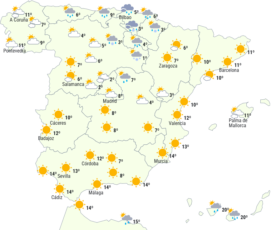 Frostgraderne vil brede sig og tage til, så der kan være tung frost i Pyrenæerne og moderat i de øvrige bjergområder på den nordlige halvdel og De Betiske Bjerge. Der ventes også svag frost i andre indlandsområder, især det nordlige højland.