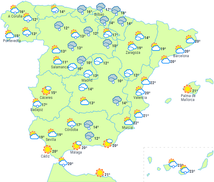 Stormene Babet og Aline forventes fortsat at have indflydelse på vejret på halvøen og De Baleariske Øer med ustabilt vejr og overvejende skyet eller overskyet himmel med nedbør, der bevæger sig fra vest mod øst.