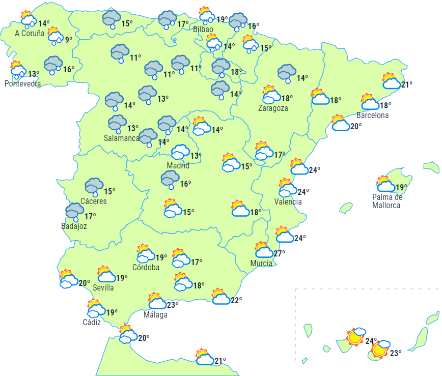 En Atlanterhavsfront nærmer sig fra den nordvestlige del af halvøen, og det betyder skyet eller overskyet himmel med mellem- og højtliggende skyer over den nordlige halvdel, der spreder sig fra vest til øst i løbet af dagen. Der forventes svag nedbør i den vestlige del af Galicien i dagens anden halvdel med mulighed for svage og lejlighedsvise byger i andre dele af det høje nord.