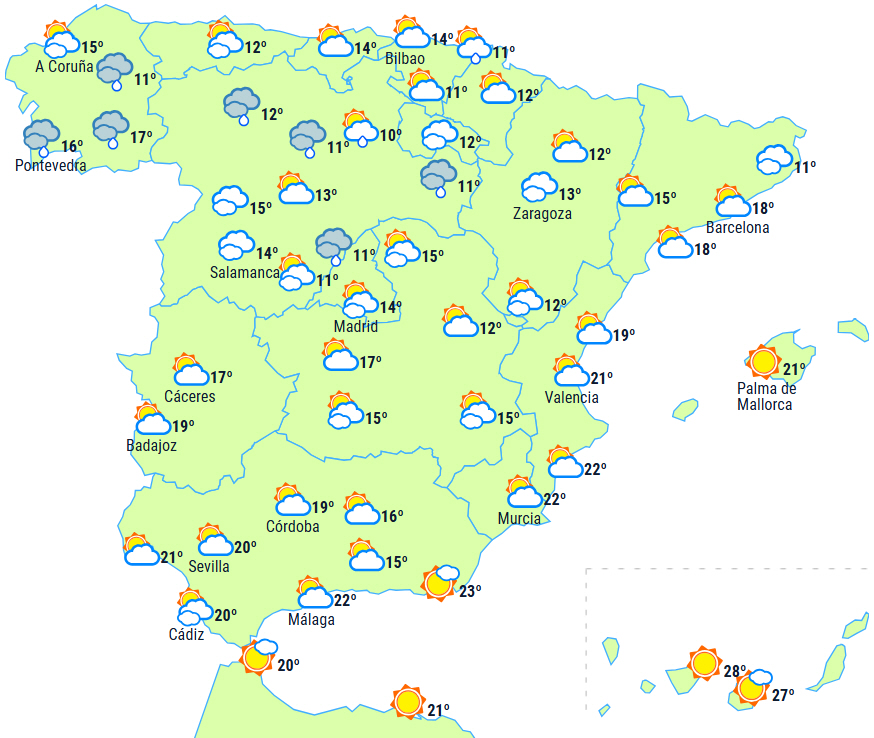 Der vil være nedbør i Galicien og Pyrenæerne, som vil have tendens til at intensivere og blive mere udbredt på den nordlige del af halvøen i løbet af dagens anden halvdel med ankomsten af en front.