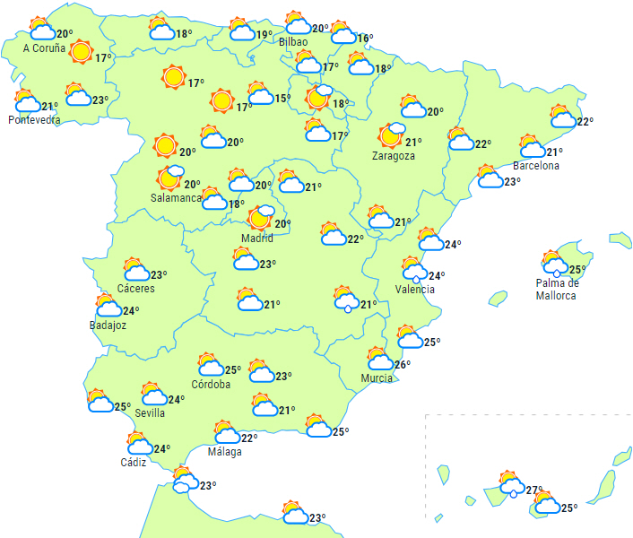 En front vil krydse den nordvestlige tredjedel af halvøen og give skyet eller overskyet himmel med nedbør på sin vej, mere rigeligt i den vestlige del af Galicien og generelt svag og lejlighedsvis i resten, hvilket også vil påvirke de vestlige Pyrenæer og den nordlige del af De Iberiske Bjerge sidst på dagen.