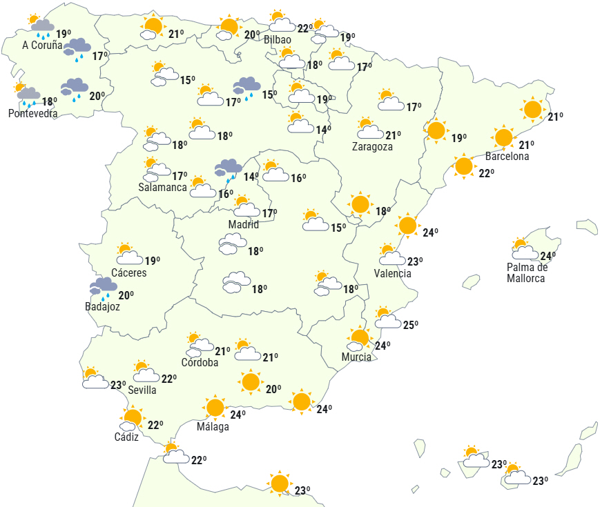 Nedbør forventes til størstedelen af den nordvestlige halvdel af halvøen, såvel som i Strædet, Béticas og lokalt i det nordlige Middelhavsområde - muligvis også i de nordlige dele af De Baleariske Øer.