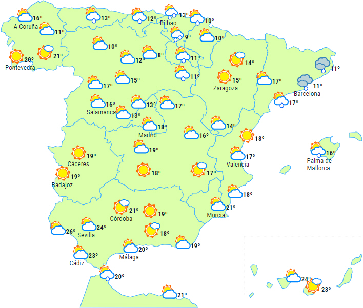 Temperaturerne vil falde på den nordlige halvdel og det centrale af halvøen samt på De Baleariske Øer, og der ventes endda et markant fald på den nordøstlige del af halvøen. Stigende temperaturer i Andalusien og ellers kun små ændringer i resten.