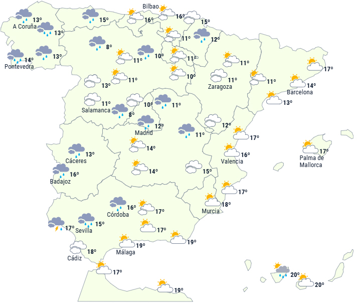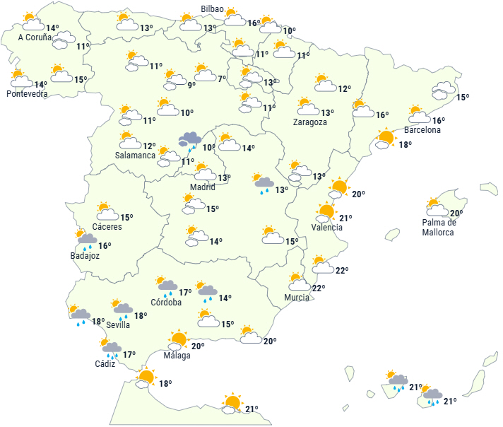Maksimumstemperaturerne falder på De Kanariske Øer, i Galicien, Asturien og ved Guadalquivir, mens de stiger på den nordøstlige halvdel af halvøen, på Balearerne og i Alborán-området.
