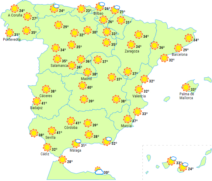 Temperaturerne kan overstige 40 grader i Guadalquivir-dalen. Nattemperaturerne vil falde på den vestlige tredjedel af halvøen og De Kanariske Øer og stige i resten, undtagen på Levante og Balearerne, hvor der kun sker få ændringer.
