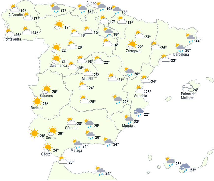 Temperaturerne vil have en nedadgående tendens på Den Iberiske Halvø og De Baleariske Øer, med mulighed for markant fald på den nordlige halvdel. Det er dog lige bortset fra Alborán-området, hvor de vil stige, og det endda markant nogle steder. Sevilla og Málaga kan således få helt op til 35 grader.