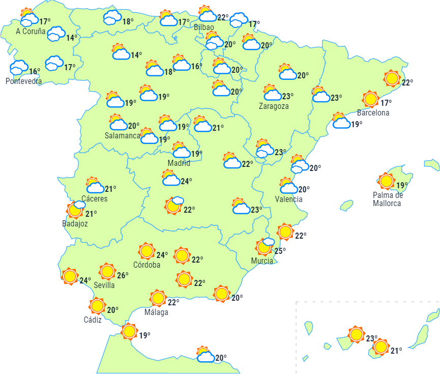 Dagstemperaturerne vil stige på det meste af halvøen og begge øgrupper, men dog falde i Galicien.