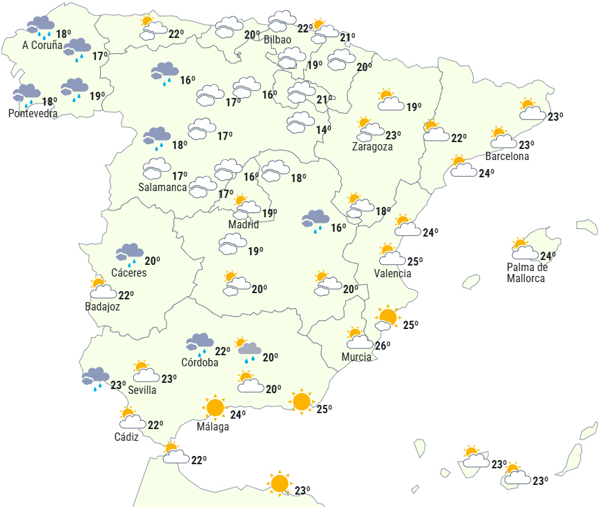 I løbet af denne dag vil vejret fortsat være præget af fugtig luft fra Atlanterhavet på Den Iberiske Halvø, og det betyder overskyet eller letskyet himmel over størstedelen. Kun i middelhavsområderne og i nordøst samt på De Baleariske Øer slipper man med højtliggende, lette skyer, mens det over den sydlige halvdel af Den Iberiske Halvø vil klare op i løbet af dagen.