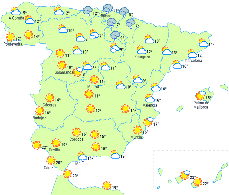 Temperaturerne vil falde, undtagen på De Kanariske Øer, hvor de vil stige. Svag frost i indlandsområderne på den nordlige halvdel af halvøen, som påvirker lavtliggende områder på den nordlige og østlige del af det nordlige højland og den nordøstlige del af det sydlige højland. Mere intens frost i Pyrenæerne.